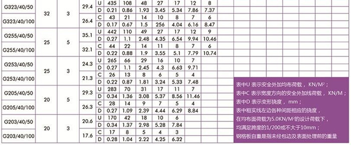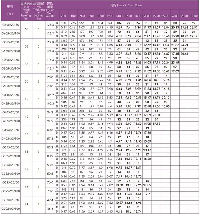 平面型扁鋼中心距為40常用鋼格柵板規格型號及安全荷載表