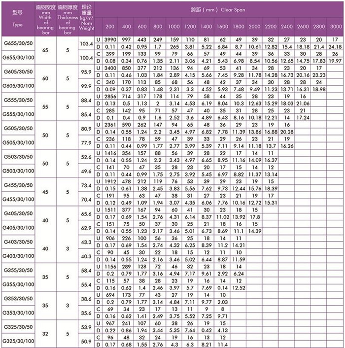 平面型扁鋼中心距為30常用格柵板規格型號及安全荷載表